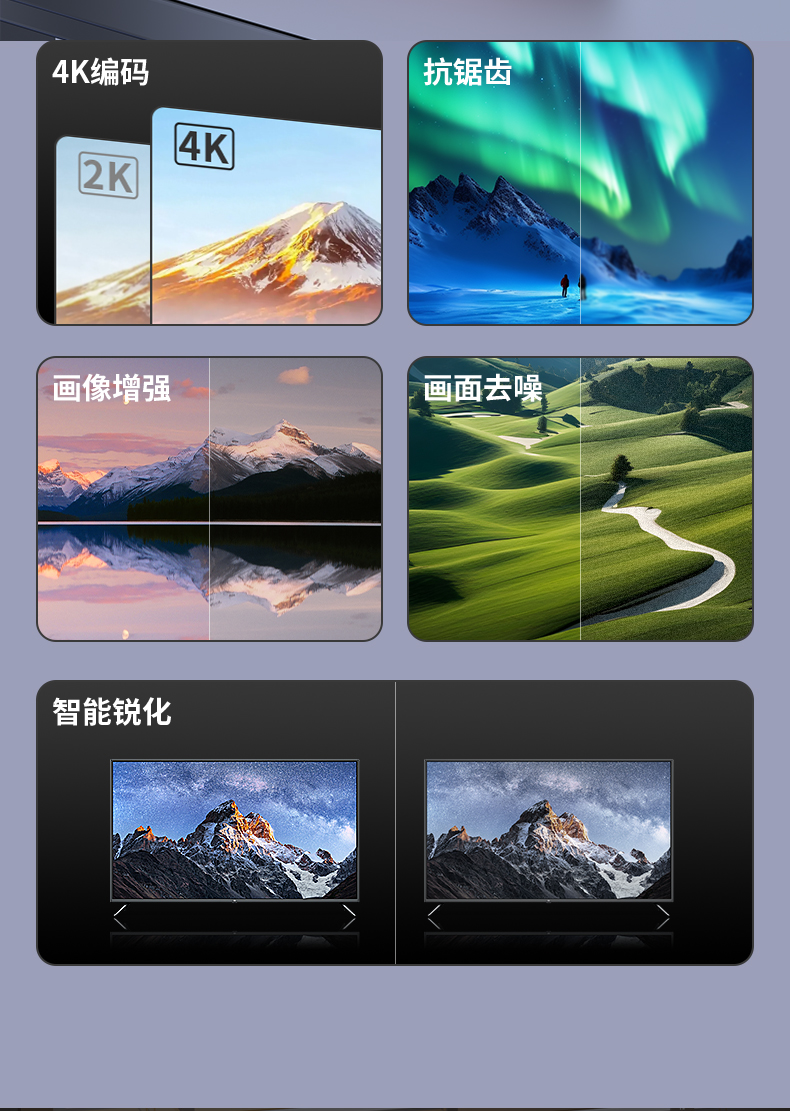 | HDMI输出分辨率 | 和输入分辨率一致,可固定输出4K60、4K50、1080P60、1080P50 |