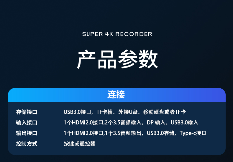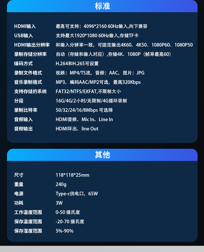 | 录制存储分辨率 | 自动(存储和输入对应),存储4K、1080P(帧率最高60) |
