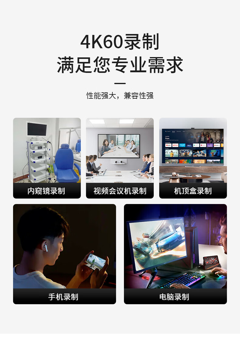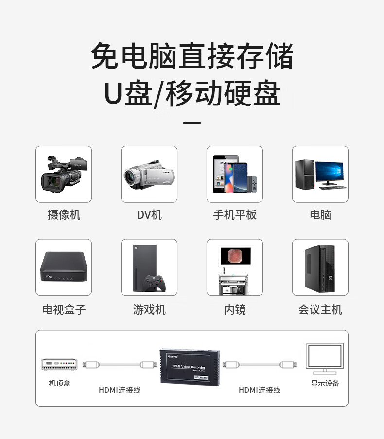 1、免驱动,免主机,免软件,随时随地采集。 2、支持各种设备HDMI输出录制,可以直接录入移动硬盘或U盘,省去复制。 3、HDMI可以和麦克风同时录制,性价比高,支持电脑USB采集,自带采集软件