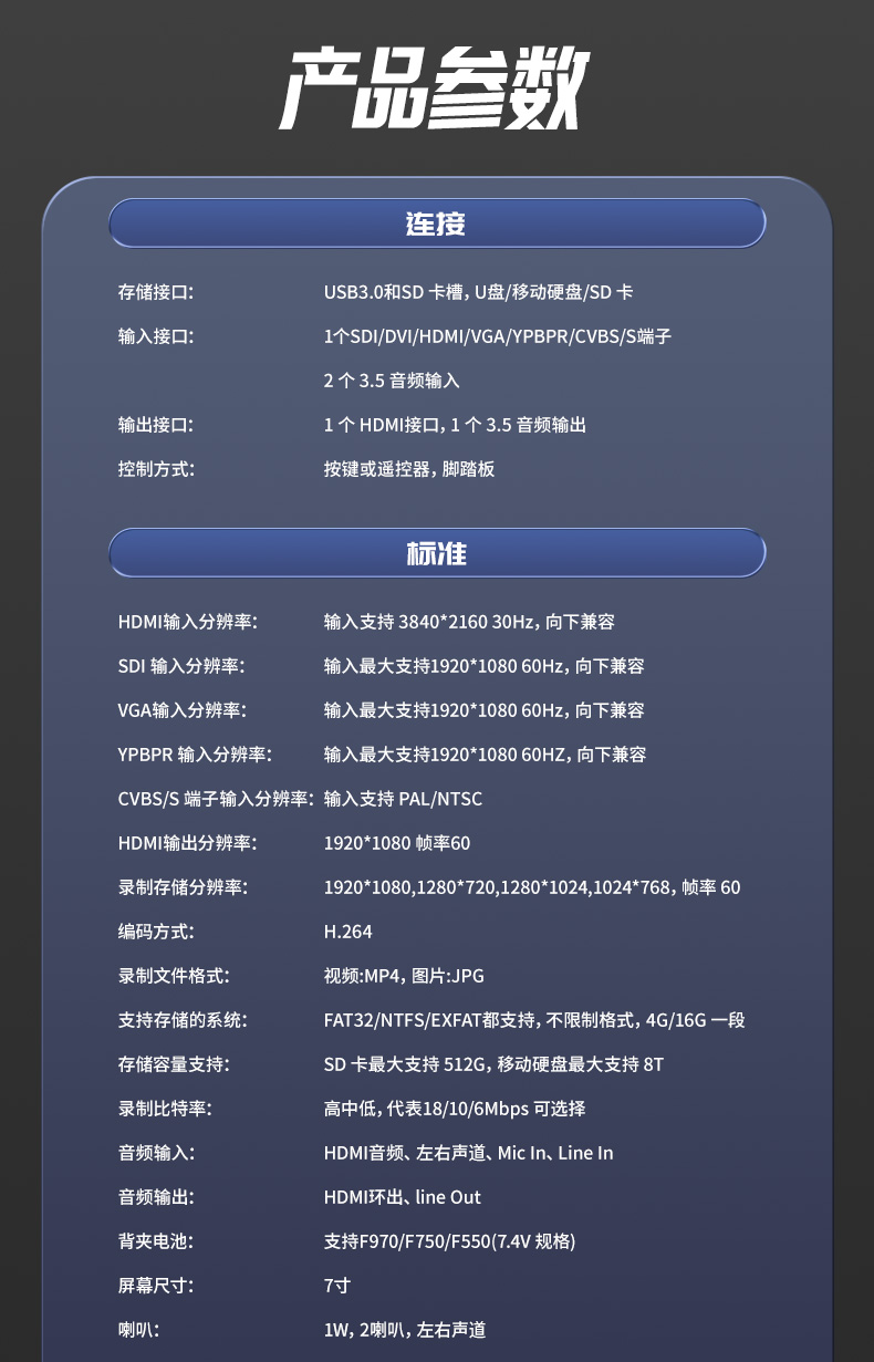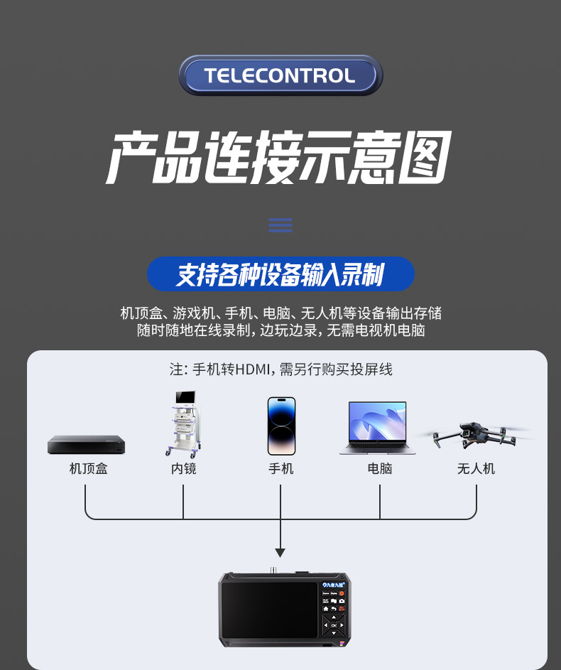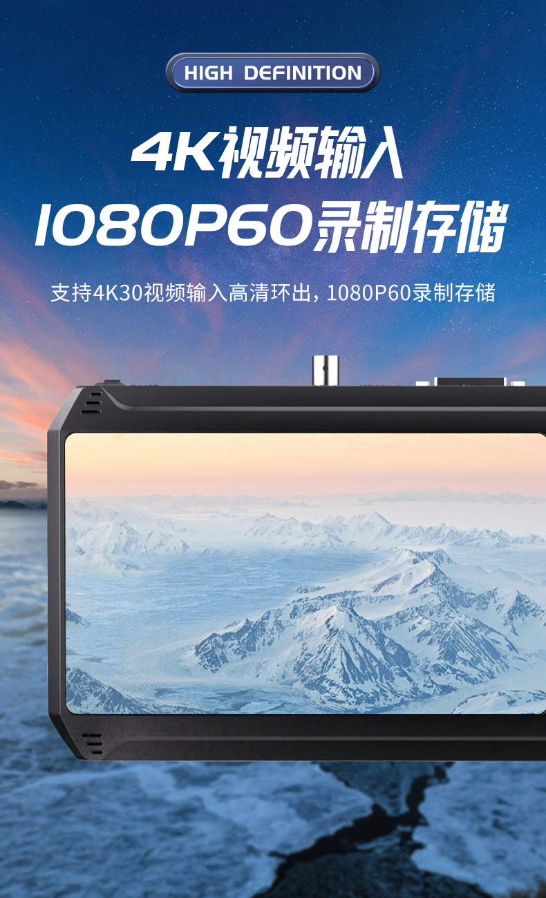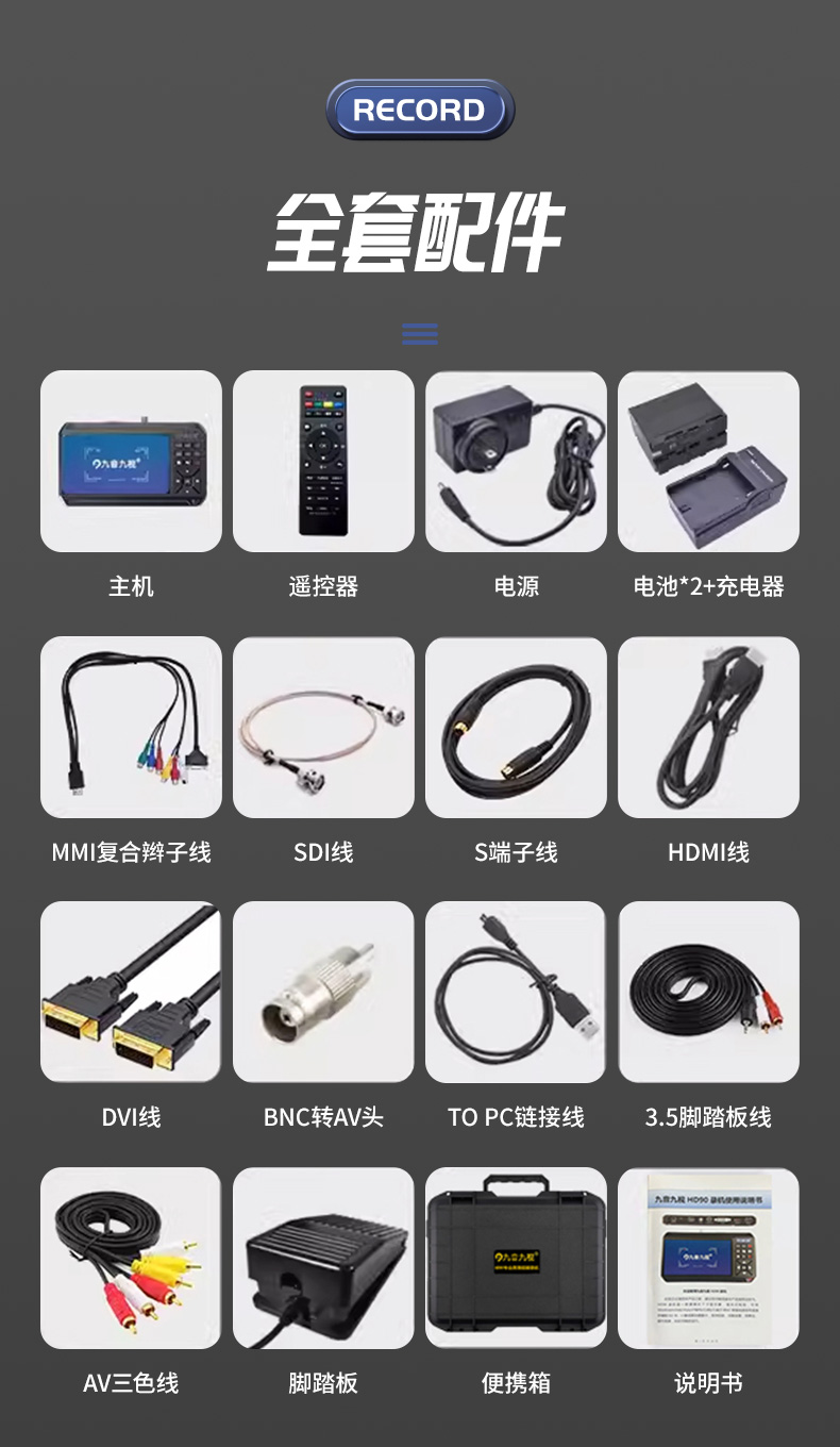 HD90录机是一款便携式7寸显示屏,背夹式电池,可将SDI/DVI/HDMI/VGA/YPBPR/CVBS/S端子/BNC等音视频信号直接存储到SD卡、U盘或移动硬盘中,支持回放,功能全面,效果佳,操作简单,长时间稳定运行。